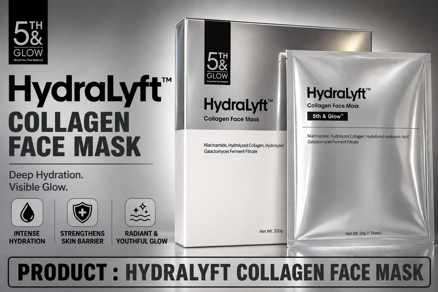 The product is marketed under 5th & Glow Hydralyft Collagen Face Mask, a brand that focuses on modern skincare backed by clean formulations. The company positions itself as a blend of science-driven innovation and nature-inspired ingredients.