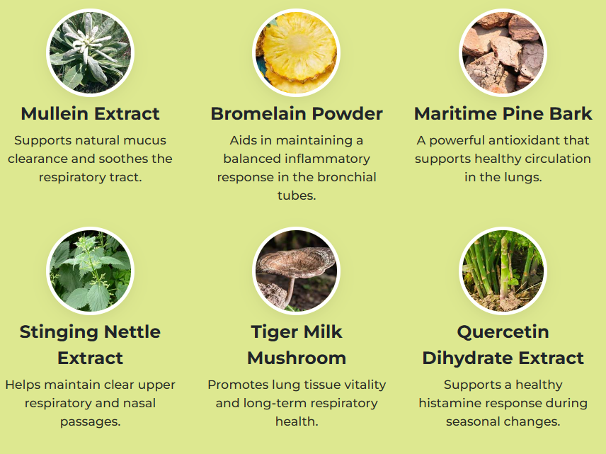 The formula combines traditional herbal extracts with modern nutritional science. Ingredients like mullein, bromelain, and quercetin help support lung cleansing, reduce inflammation, and promote easier breathing.